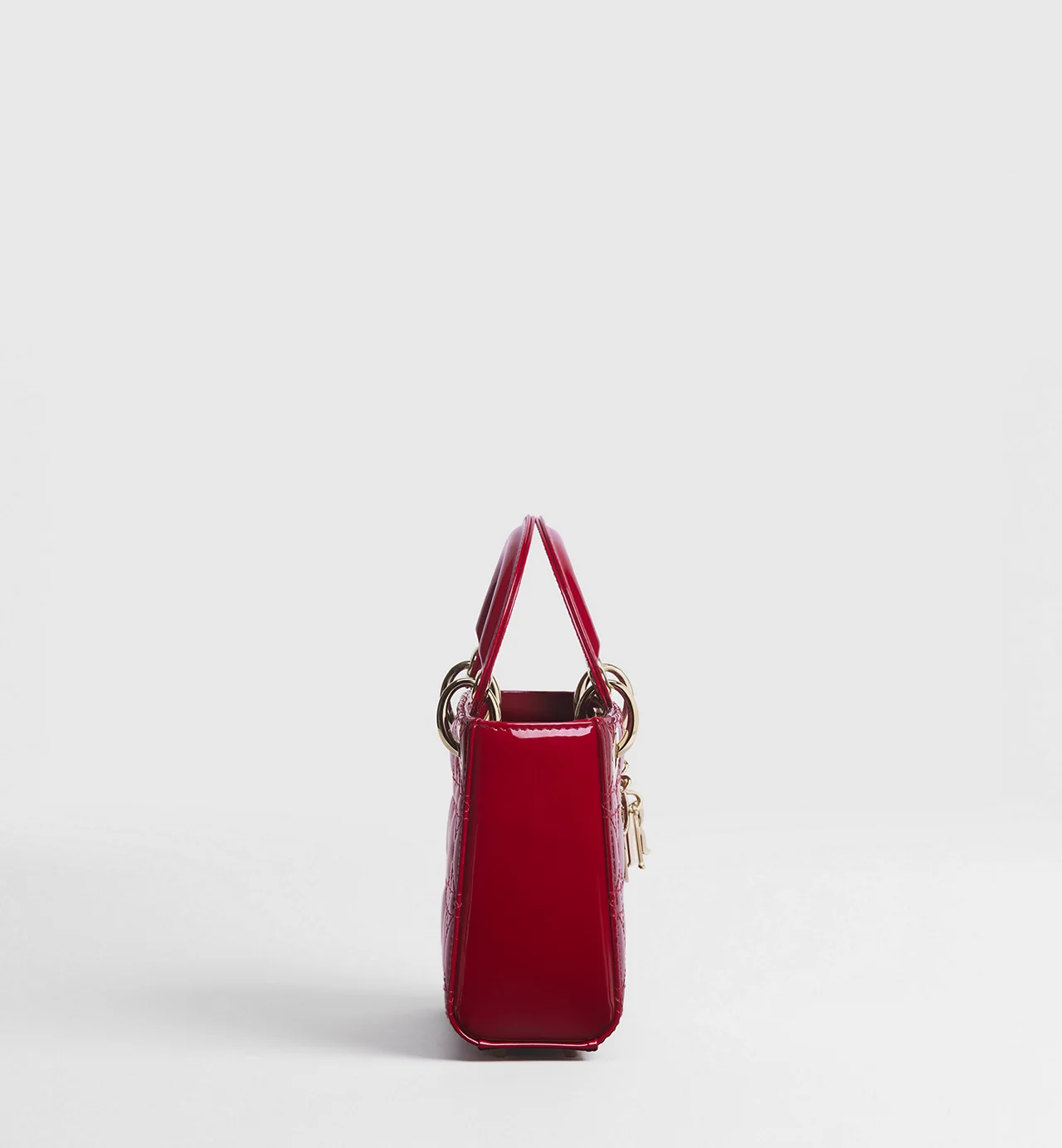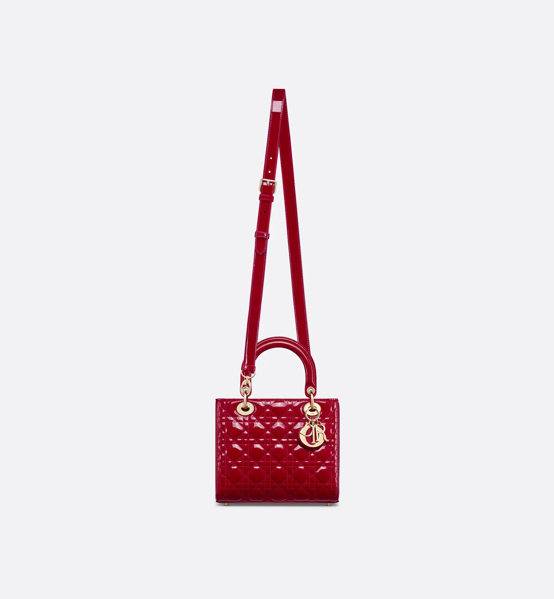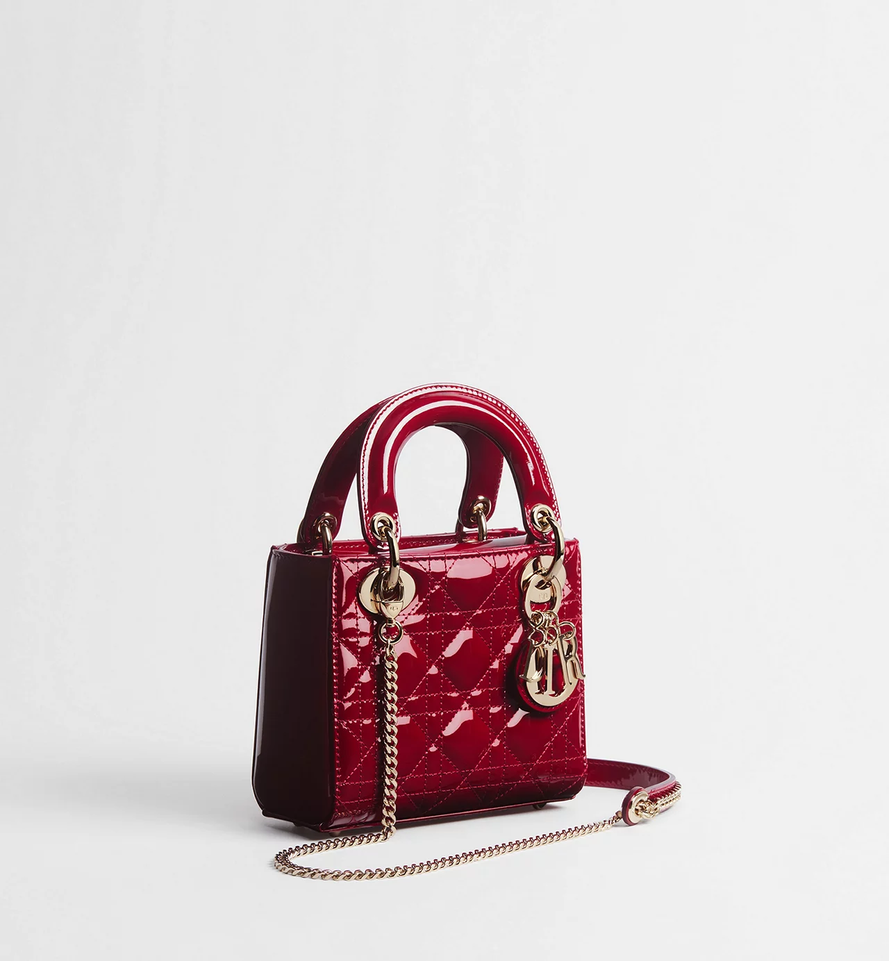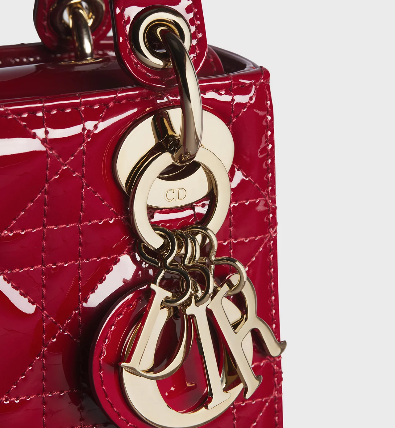 El bolso Lady Dior refleja a la perfección la visión de la elegancia y la belleza de la Maison. Este modelo atemporal presenta un diseño refinado de piel de becerro acharolada rojo cereza con costuras Cannage, que crean la legendaria e inconfundible textura acolchada. Los charms D.I.O.R. de metal dorado pálido acentúan su silueta. El bolso Lady Dior en miniatura incluye una correa de cadena extraíble y puede llevarse en la mano o cruzado para sublimar sus looks de noche.
