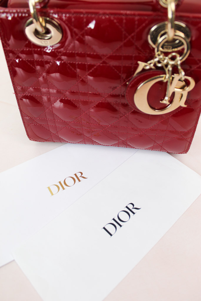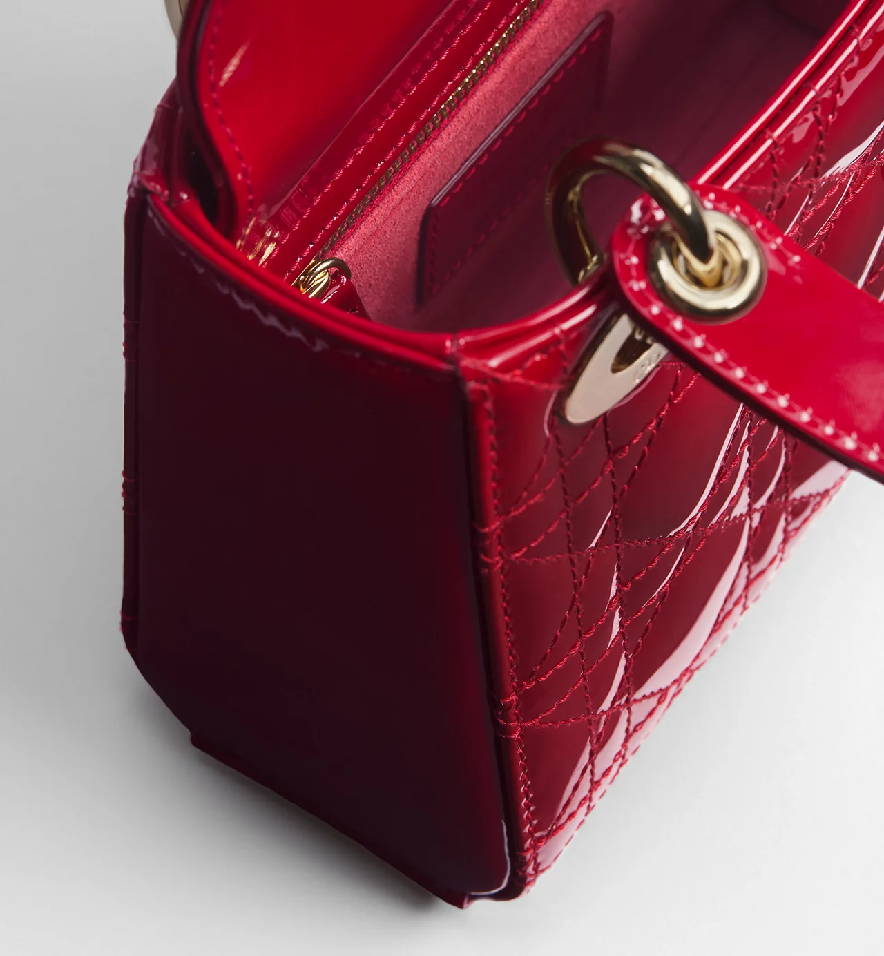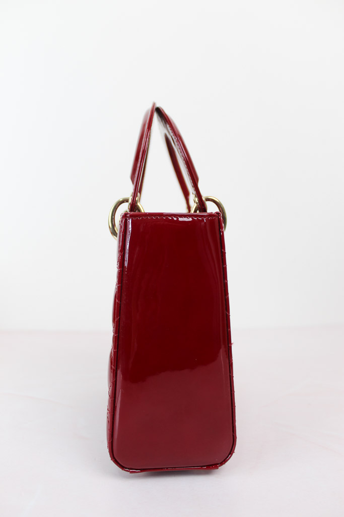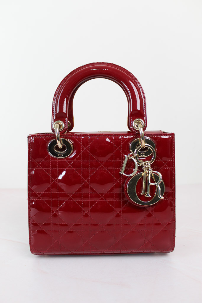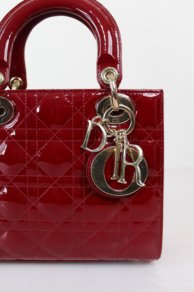 El bolso Lady Dior refleja a la perfección la visión de la elegancia y la belleza de la Maison. Este modelo atemporal presenta un diseño refinado de piel de becerro acharolada rojo cereza con costuras Cannage, que crean la legendaria e inconfundible textura acolchada. Los charms D.I.O.R. de metal dorado pálido acentúan su silueta. El bolso Lady Dior en miniatura incluye una correa de cadena extraíble y puede llevarse en la mano o cruzado para sublimar sus looks de noche.