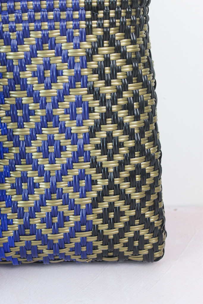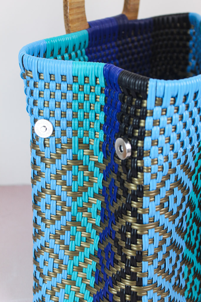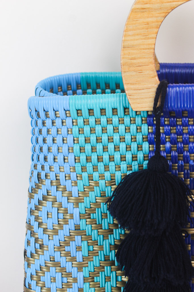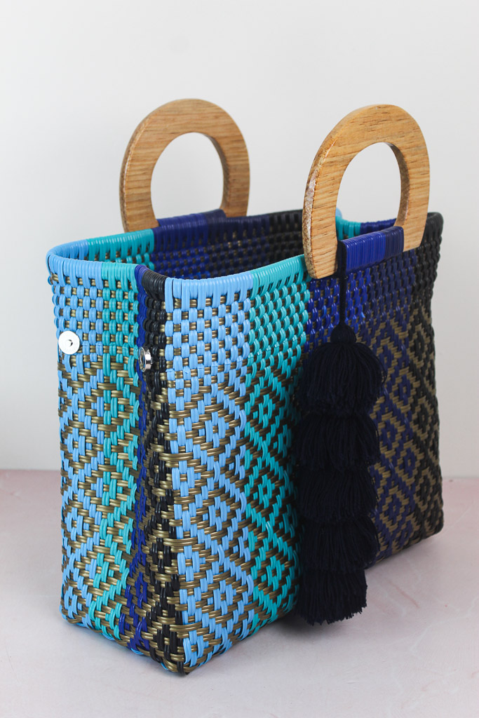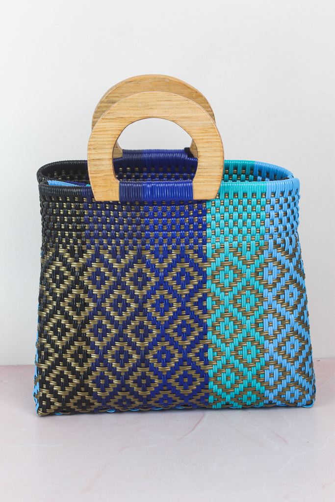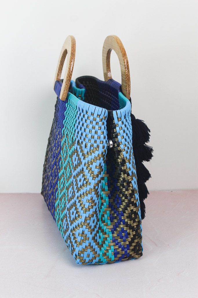 Bolso mediano tejido con con asas de madera hecho a mano de material sostenible.