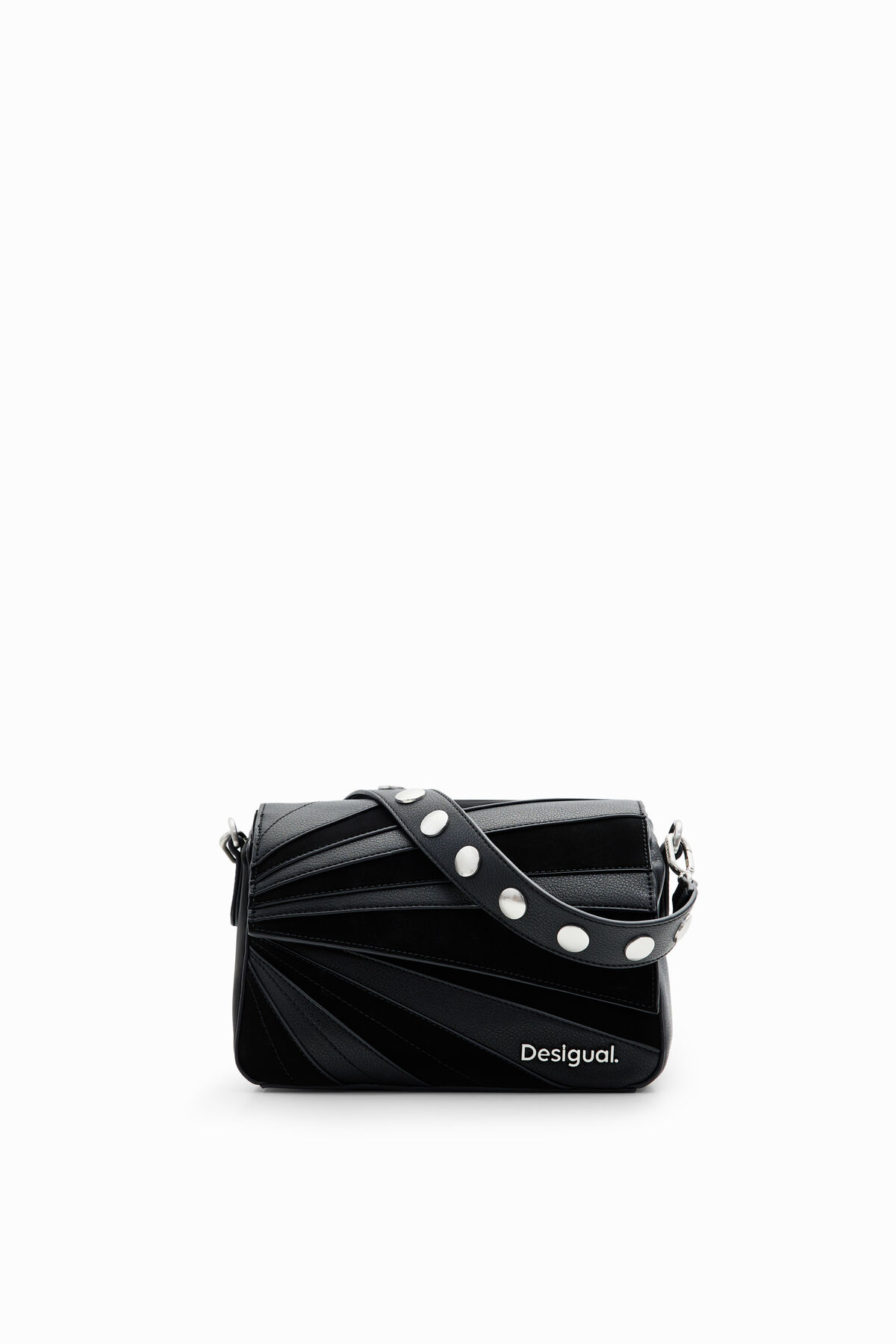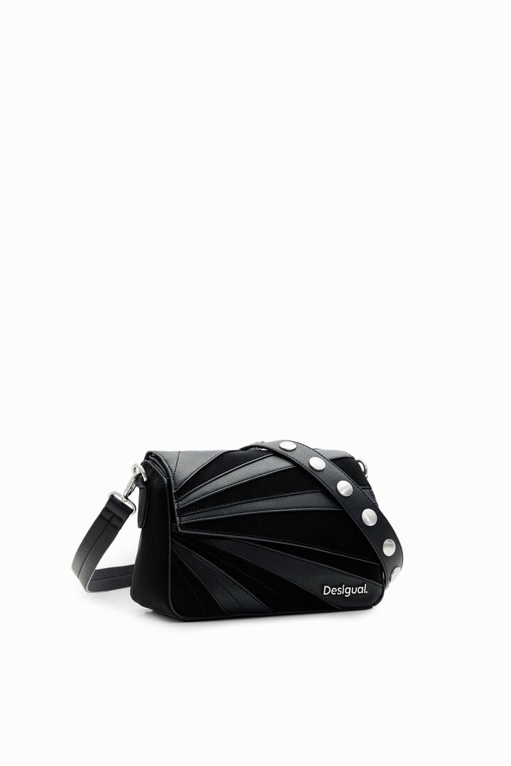 Bolso pequeño de mano en tejido efecto piel con patch de diferentes texturas, varias asas y bolsillos.