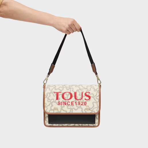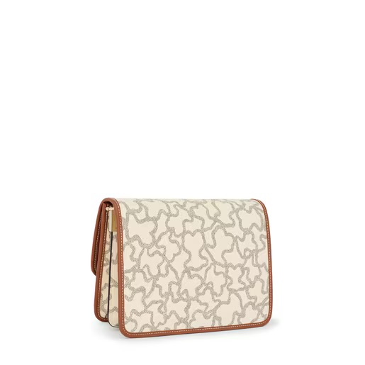 Bolso bandolera mediano Audree TOUS Kaos Icon de lona con estampado Kaos en color beige y detalles de piel sintética. Bolso con dos compartimentos separados por un bolsillo con cierre de cremallera y un bolsillo abierto en la parte delantera. Cierre de solapa con dos botones magnéticos. Asa de hombro extraíble con ganchos y asa bandolera ajustable y extraíble.