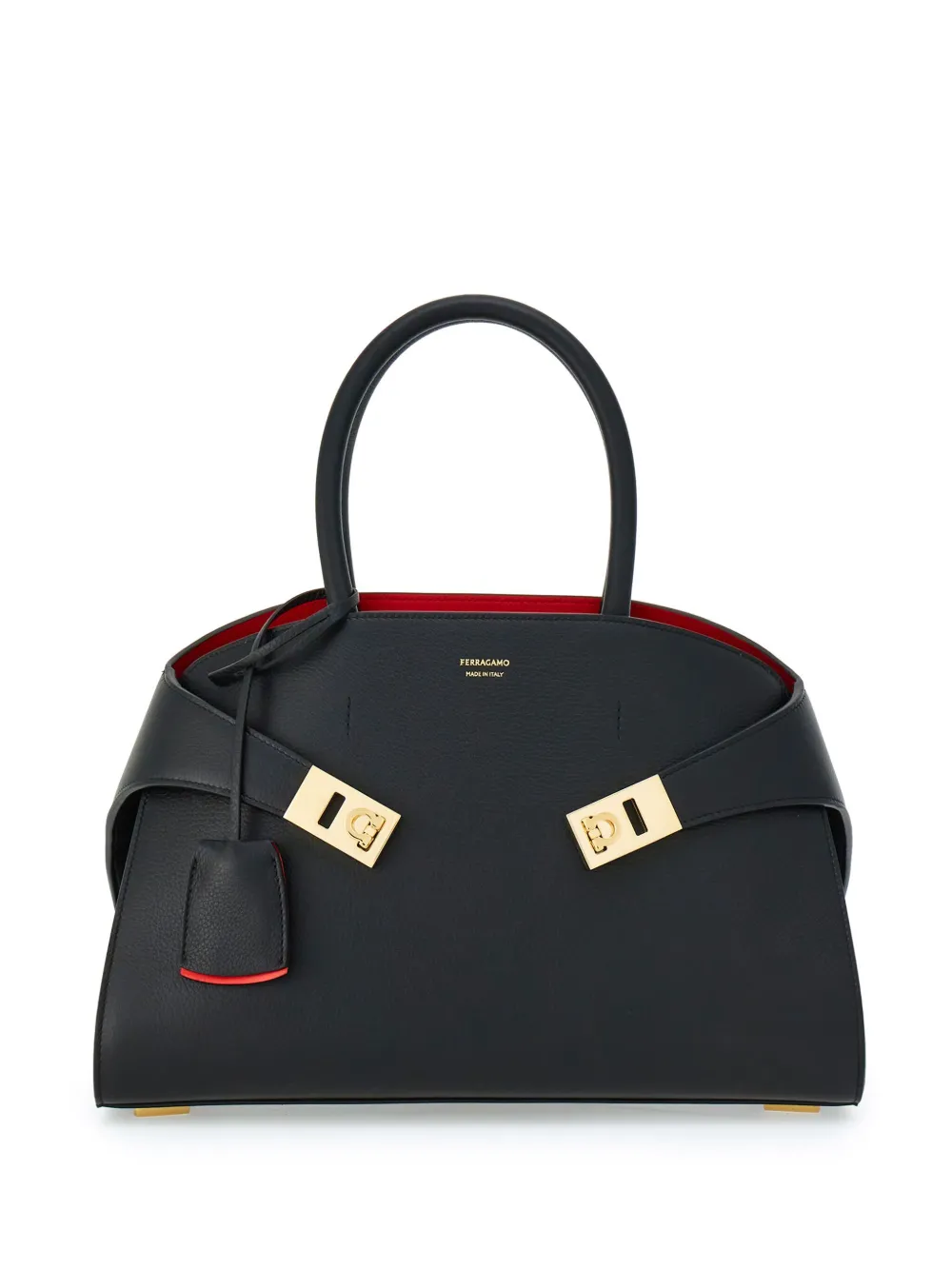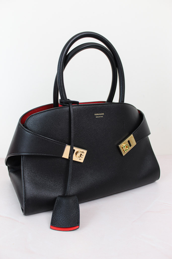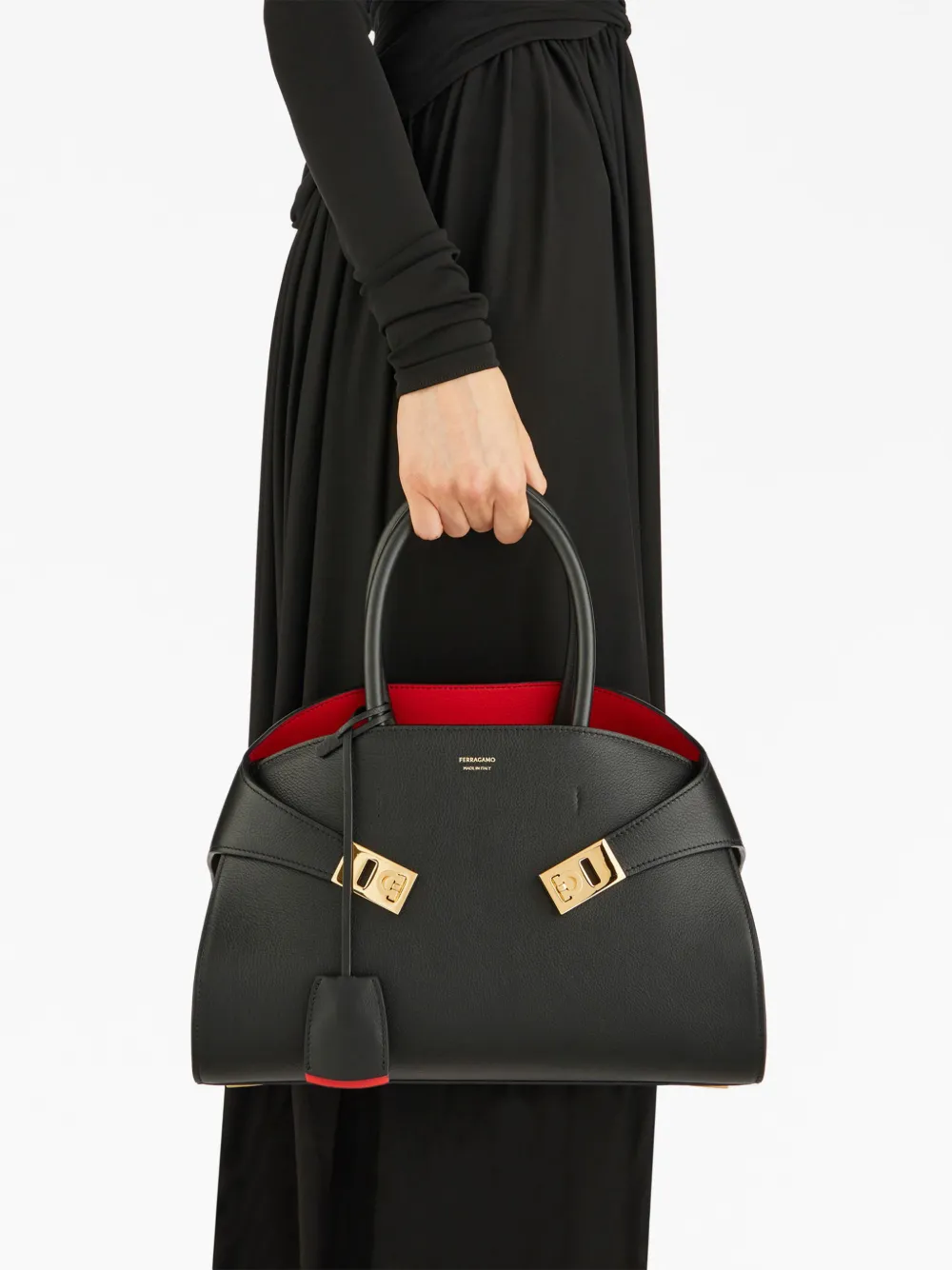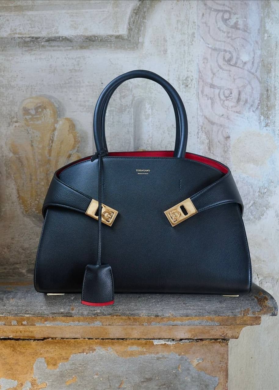 Una interpretación compacta del bolso con asas superior de Ferragamo, con líneas inspiradas en los modelos retro. De estructura suave, presenta paneles de piel de becerro de grano natural y una parte trasera asimétrica que abraza los fuelles y se abrocha en la parte delantera con hebillas Gancini. El interior a contraste añade un acento gráfico y asertivo, complementado con charms llaveros.