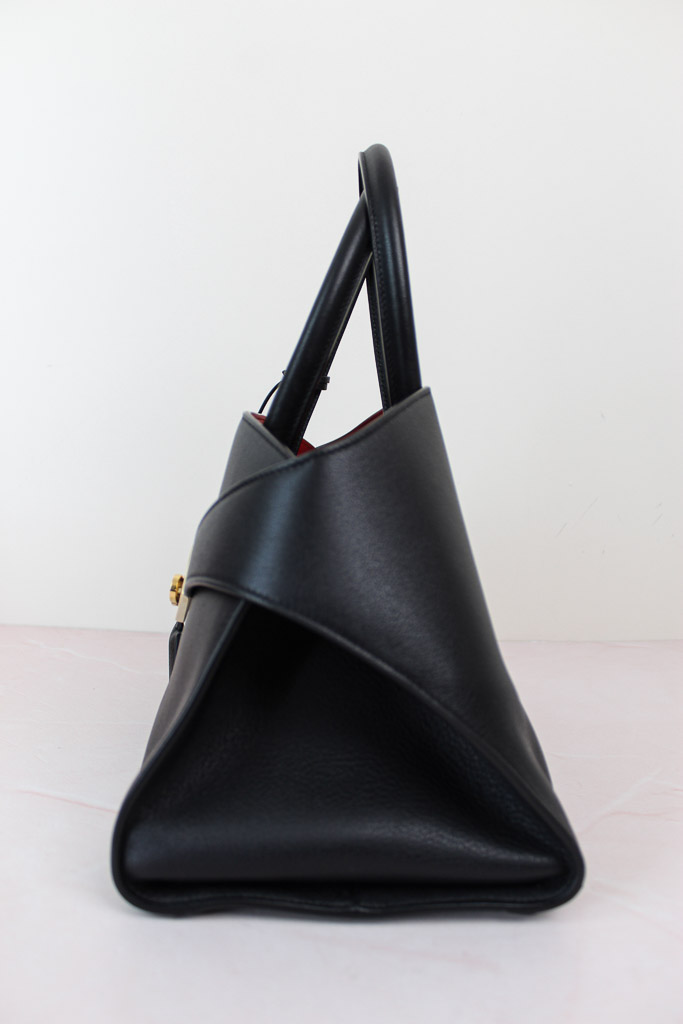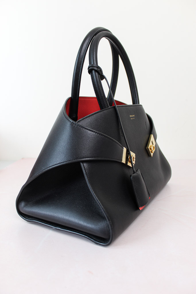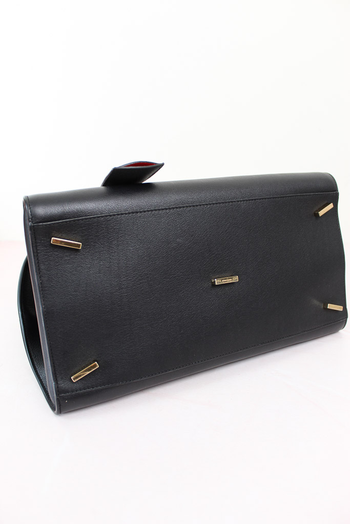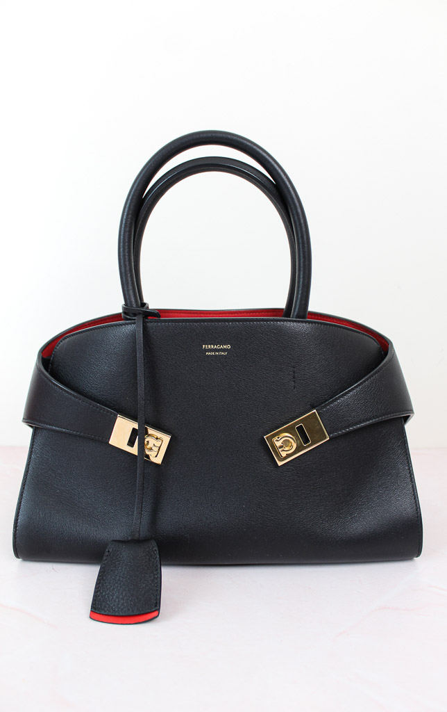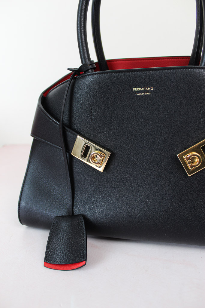 Una interpretación compacta del bolso con asas superior de Ferragamo, con líneas inspiradas en los modelos retro. De estructura suave, presenta paneles de piel de becerro de grano natural y una parte trasera asimétrica que abraza los fuelles y se abrocha en la parte delantera con hebillas Gancini. El interior a contraste añade un acento gráfico y asertivo, complementado con charms llaveros.