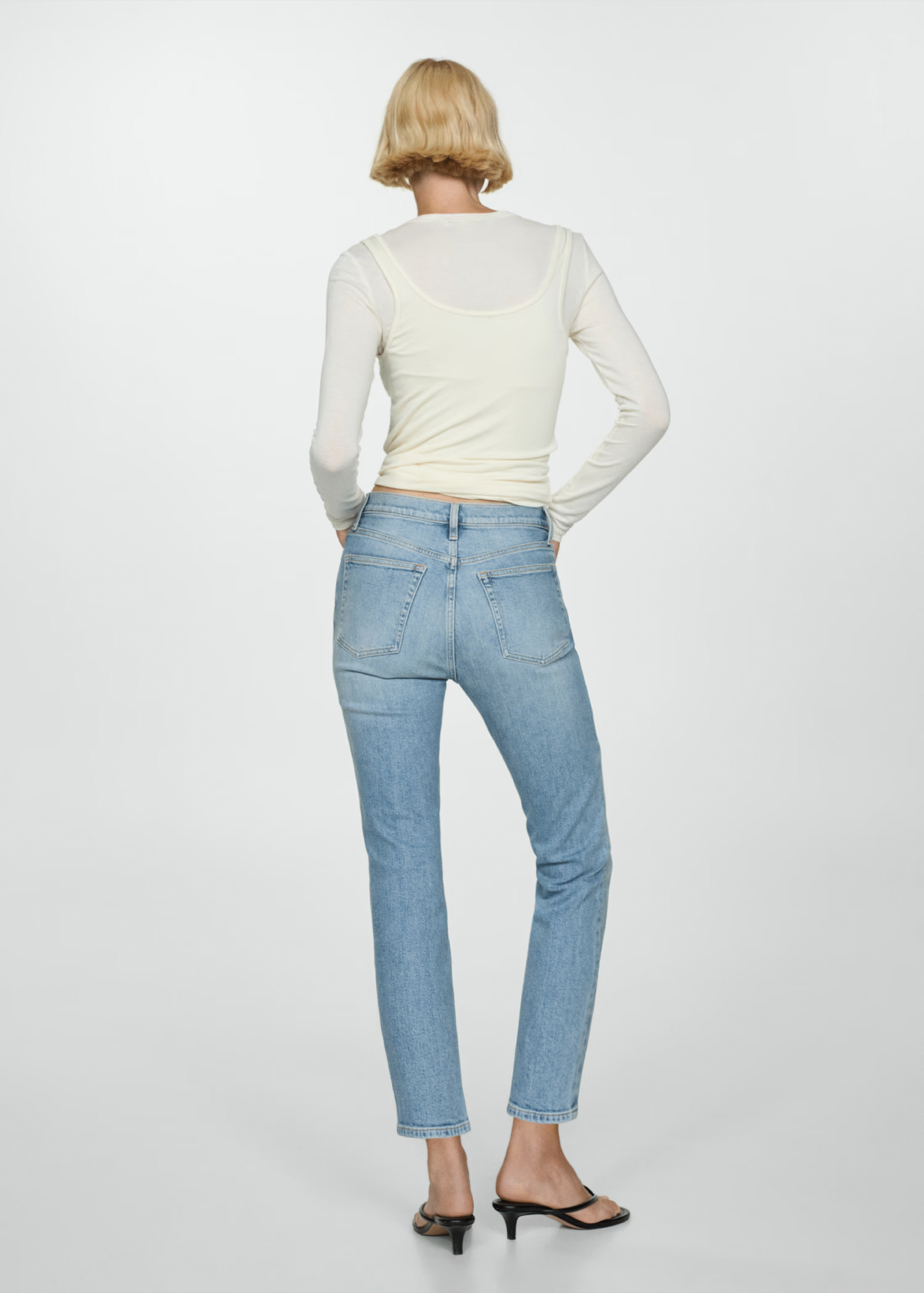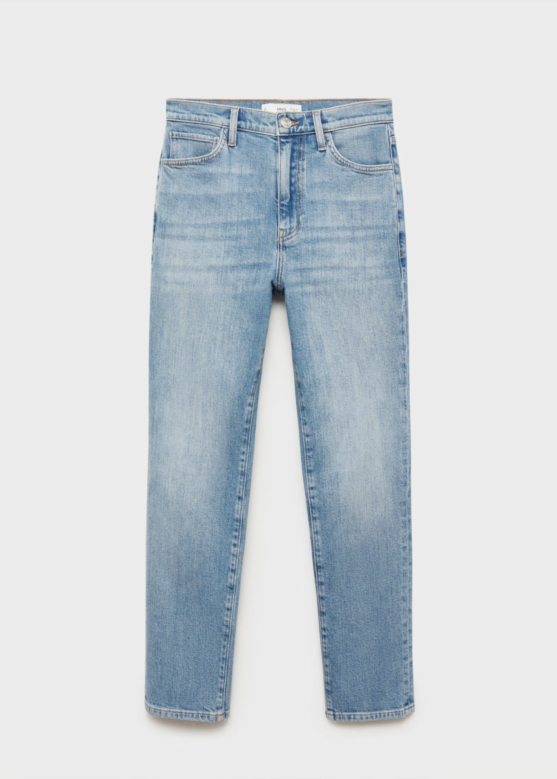 Tejido de algodón estilo tejano vaquero. Tejido elástico. Diseño crop. Slim fit. Tiro alto. Trabillas. Cinco bolsillos. Cierre de cremallera y botón.