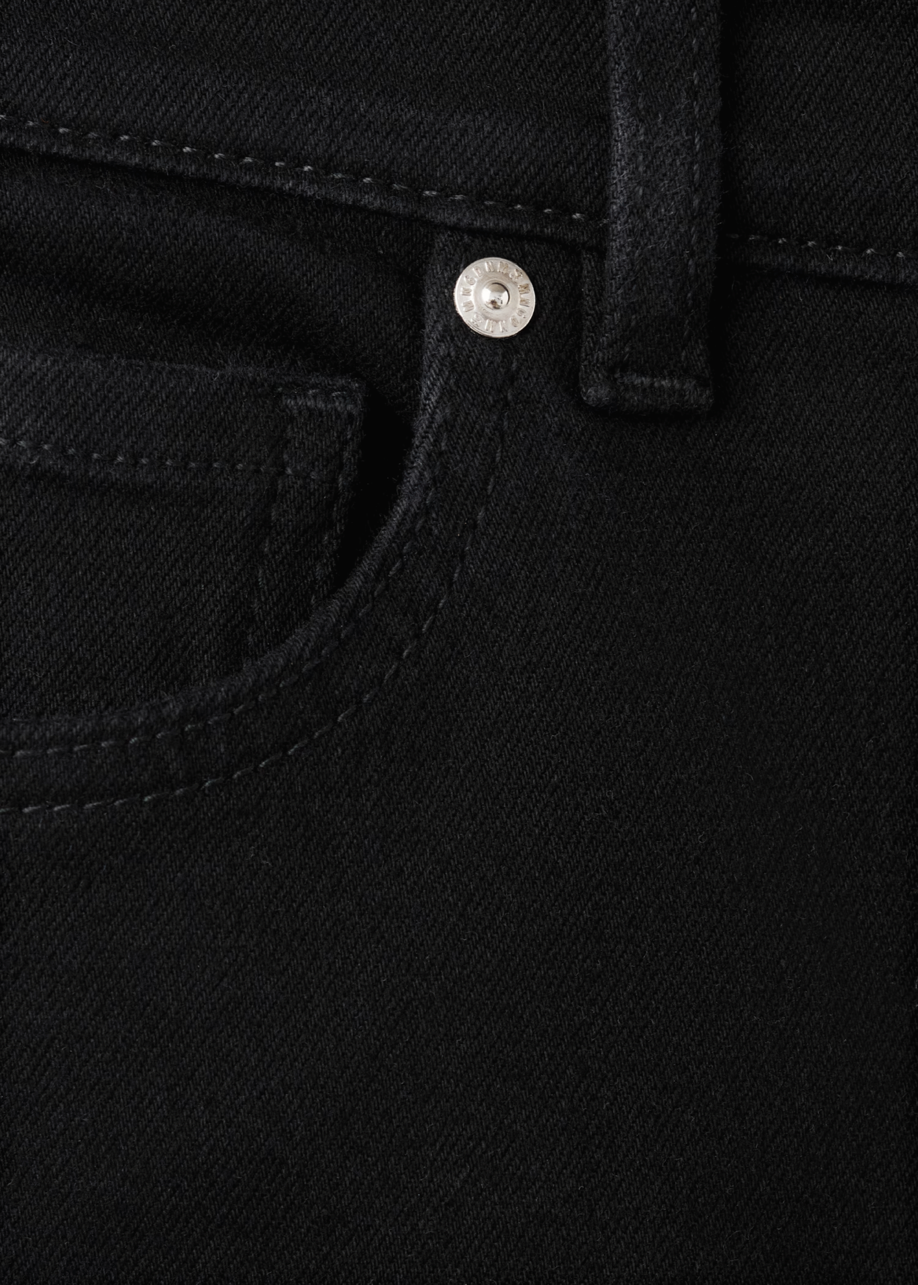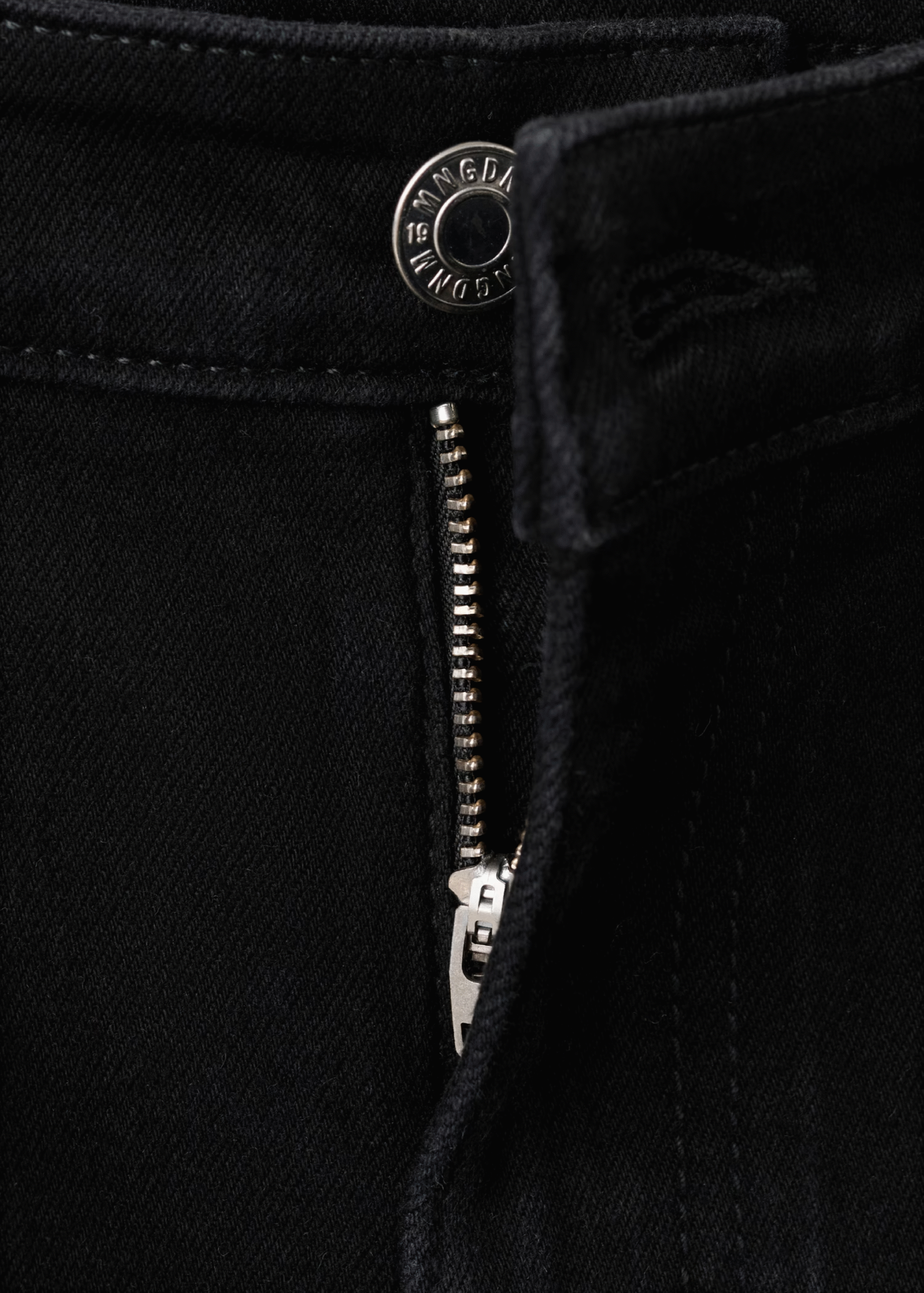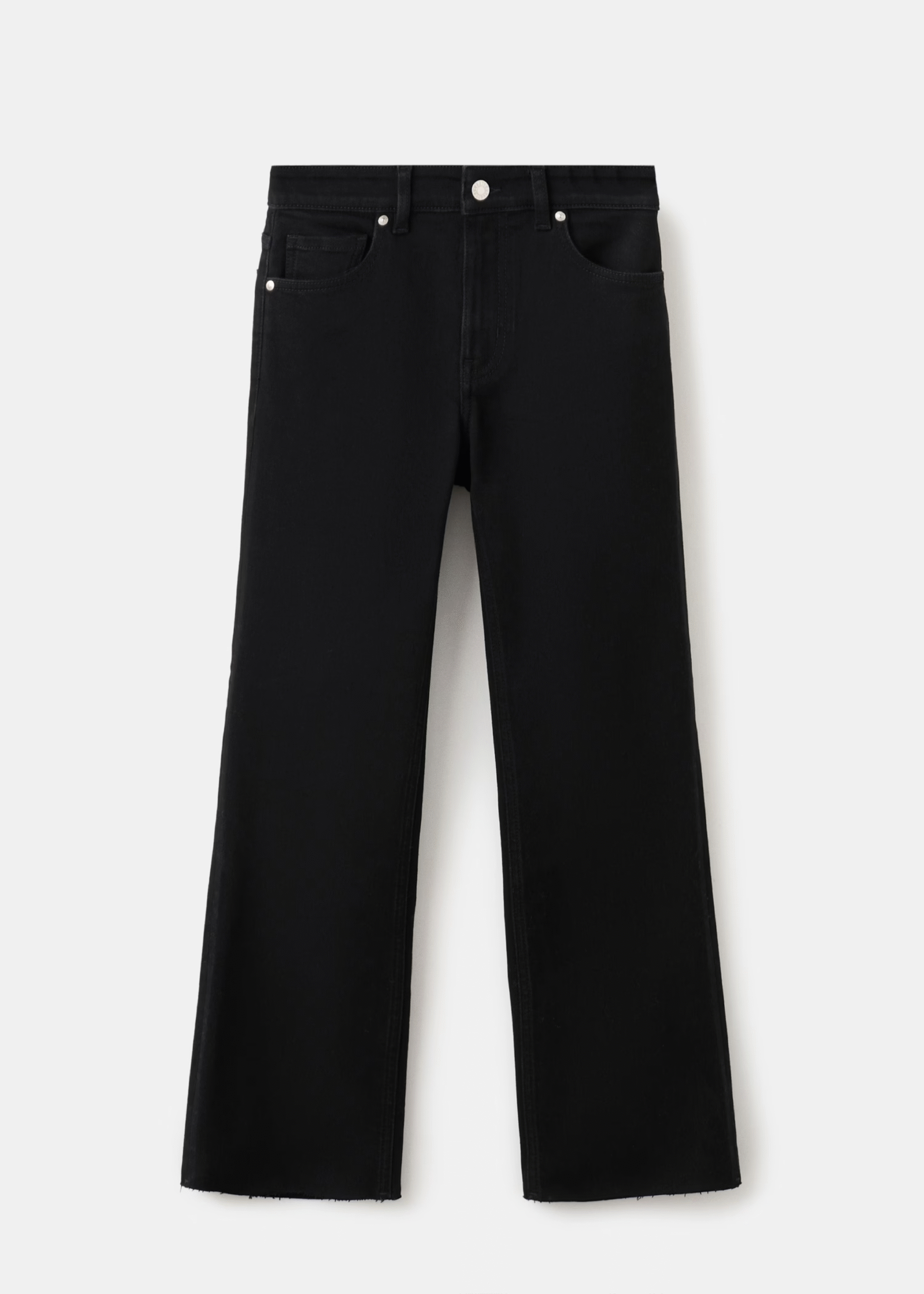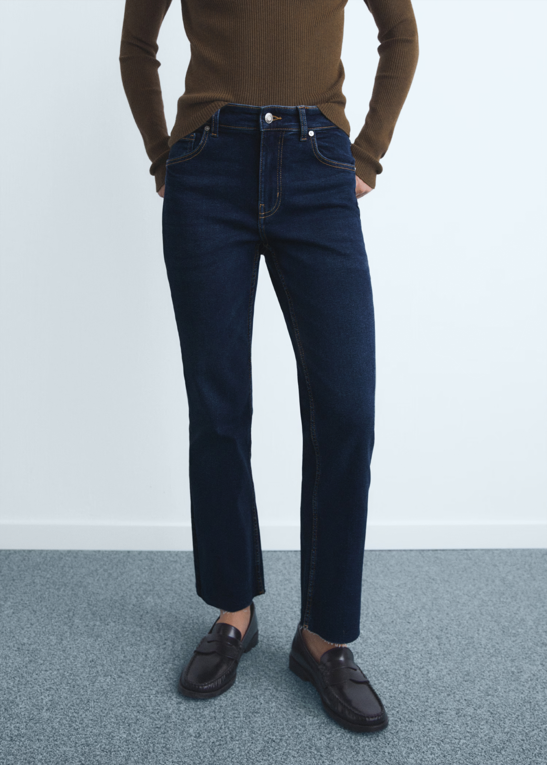 Denim-style cotton fabric. Stretch fabric. Crop design. Flare design. Mid-rise. Belt loops. Five pockets. Frayed hem. Zip and button fastening. Inside length 65 cm. Available Plus. Comfort fabric with elasticity.
