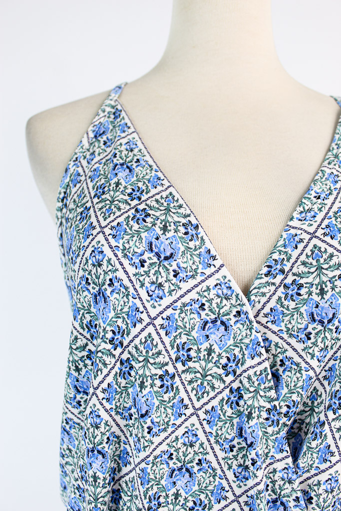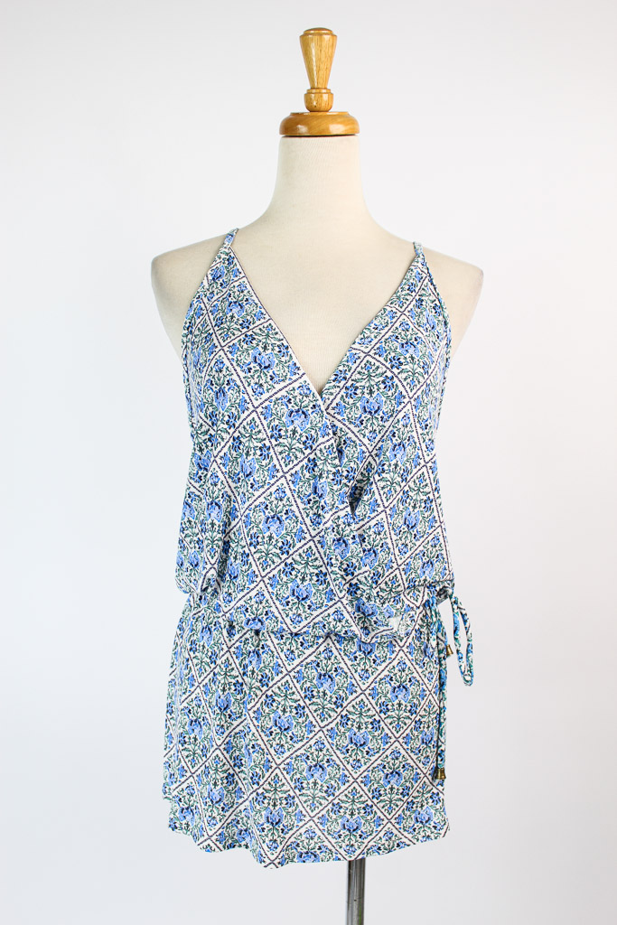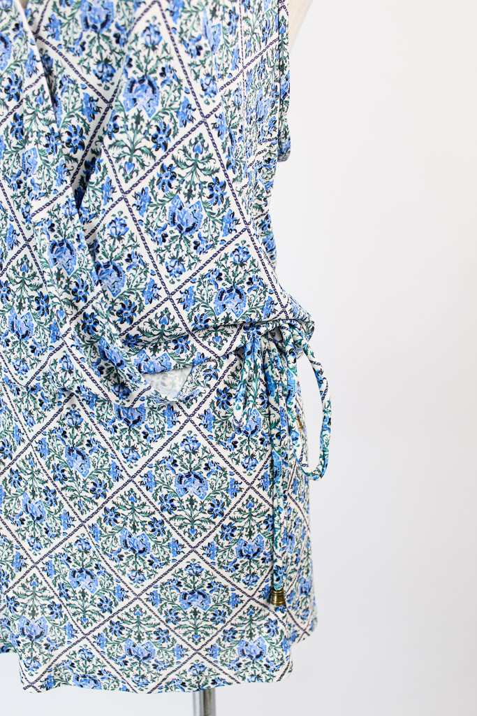 Vestido corto con escote en V, estilo cruzado y lazo en la cintura.
