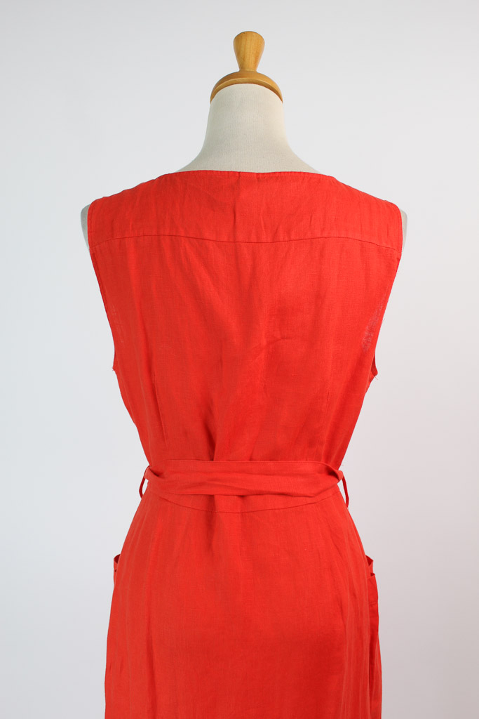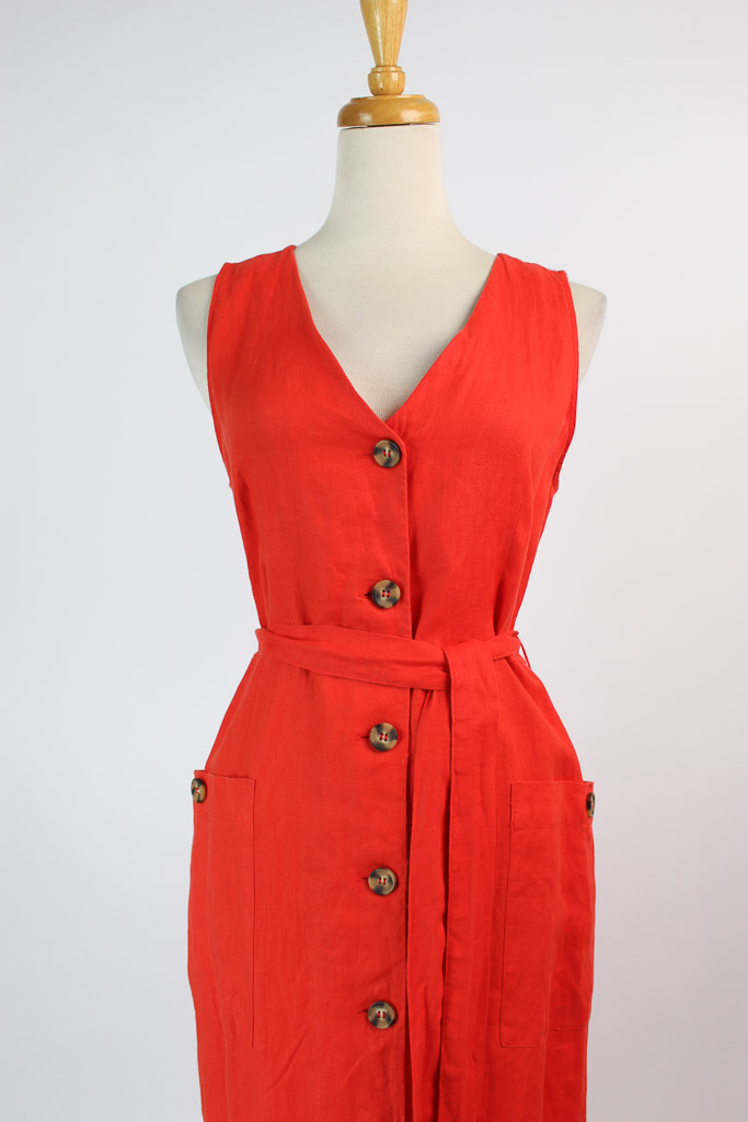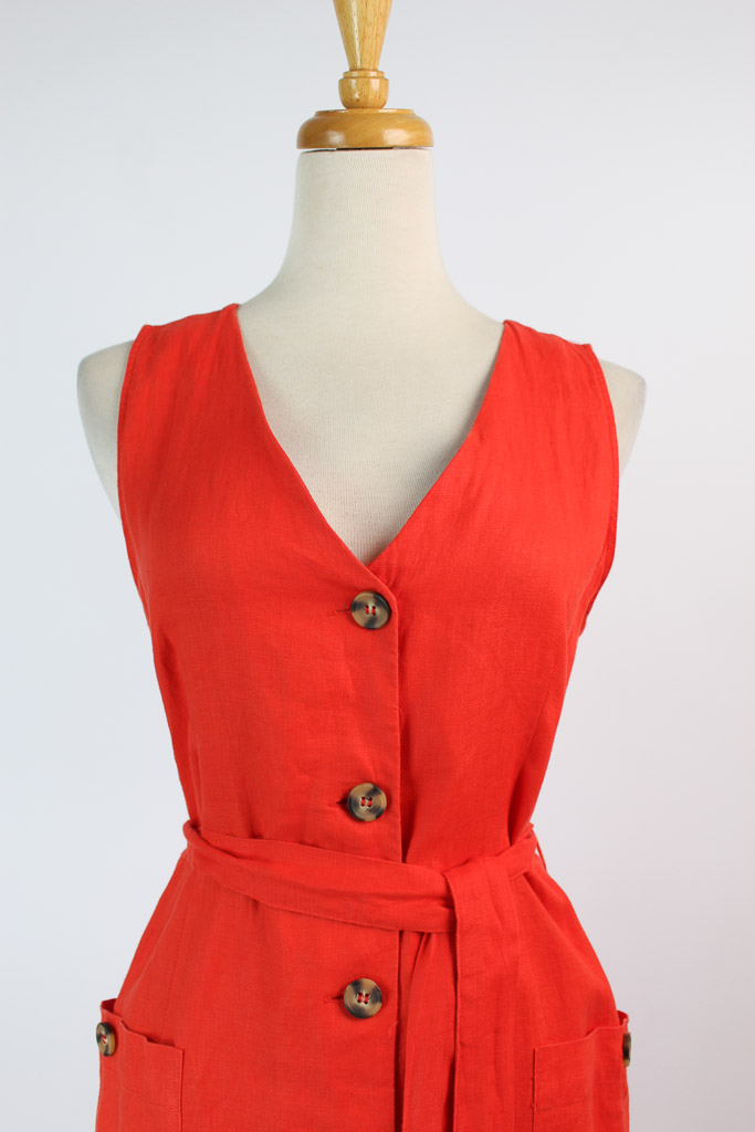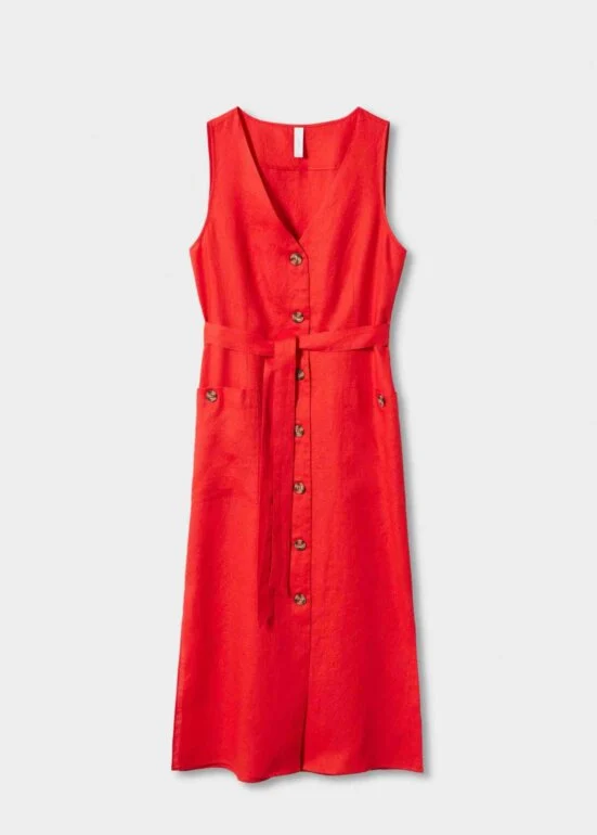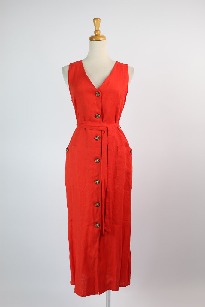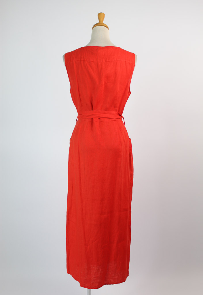 100% linen fabric. Shirt-style. Straight design. Midi design. V-neck. Wide straps. Two side patch pockets. Button fastening on the front section.