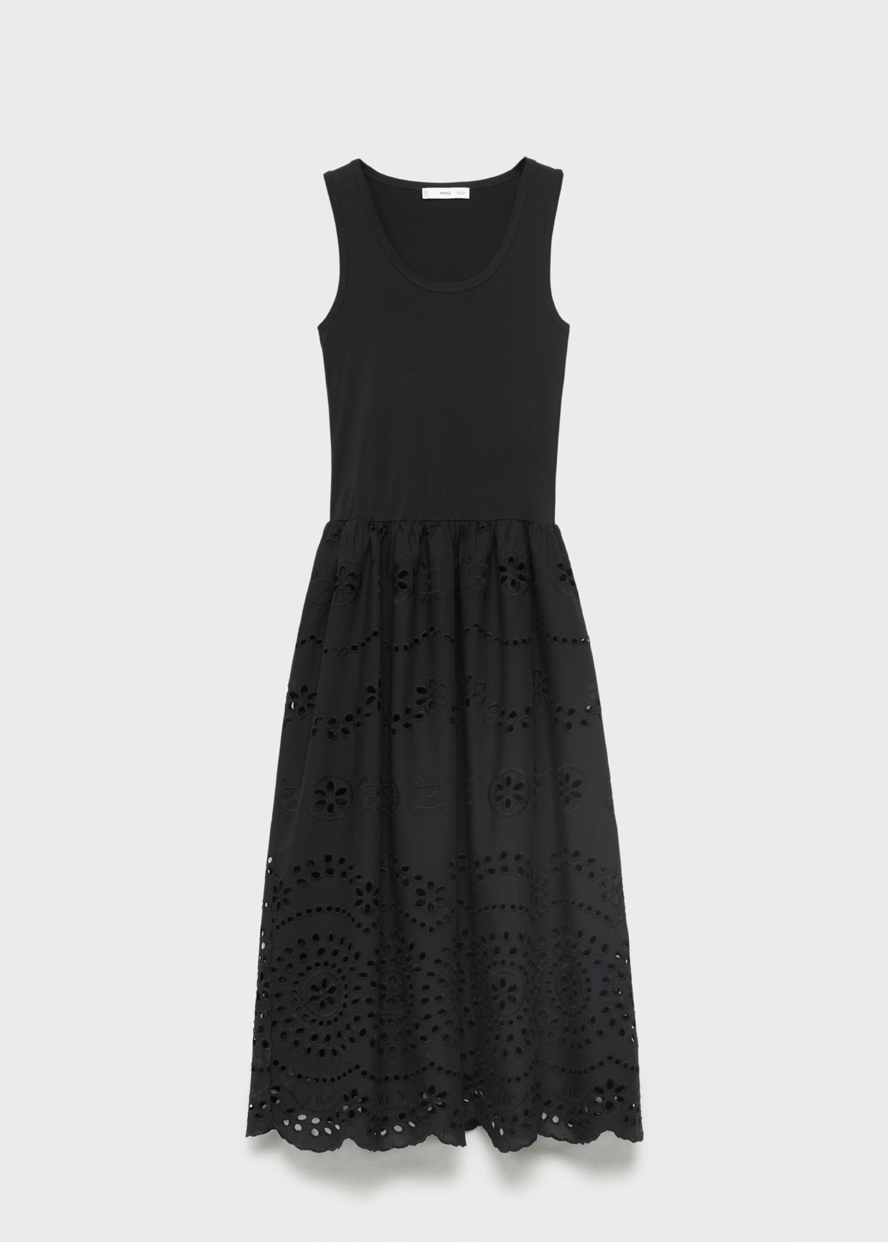 Tejido de algodón. Diseño largo. Diseño evasé. Cuello redondo escotado. Sin mangas. Tirantes anchos. Detalles bordados y calados en la falda. Sin cierre. Esta prenda forma parte de nuestra colección casual, diseñada para acompañarte con estilo en tu día a día.