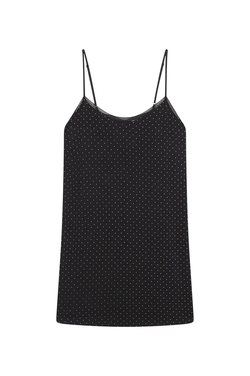 Camisón midi de tirantes finos en viscosa suave ECOVERO™, con estampado allover de lunares. Diseñado con escote en pico y puntilla a tono, ofrece comodidad y estilo elegante.