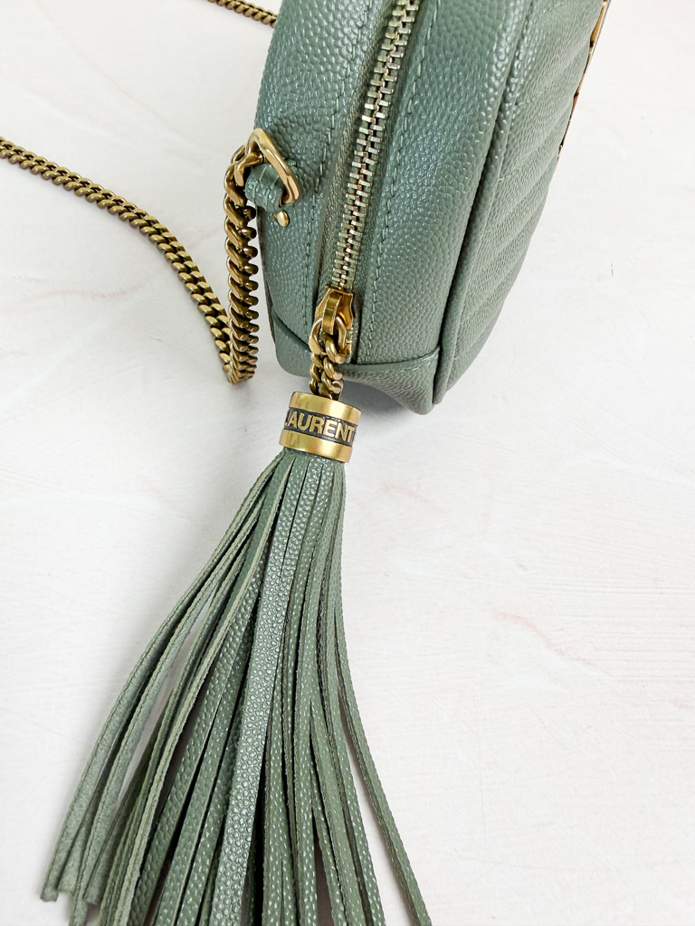 Este elegante y sofisticado bolso bandolera Yves Saint Laurent Chevron Quilted Monogram Lou Camera tiene el tamaño perfecto para guardar tu celular, llaves maquillaje. El bolso está confeccionado en piel de becerro granulada brillante y cuenta con una correa larga de cadena y cierre de cremallera con borla. El icónico logotipo de YSL ocupa un lugar destacado en la parte delantera. El precio retail es de $1557