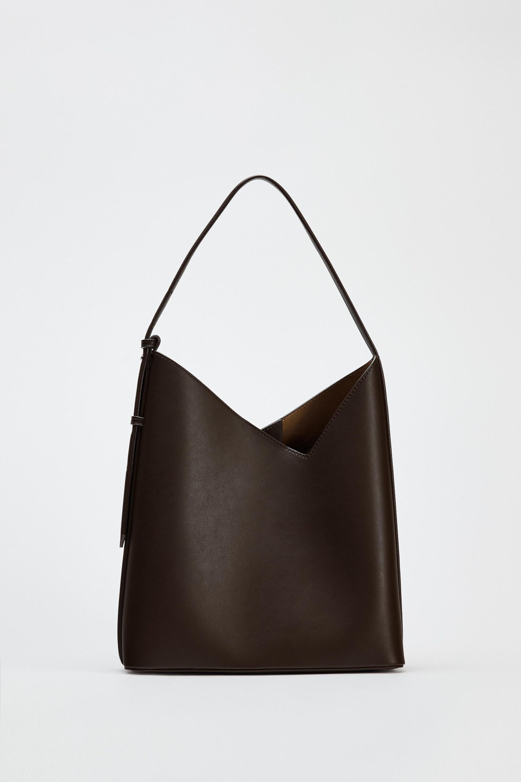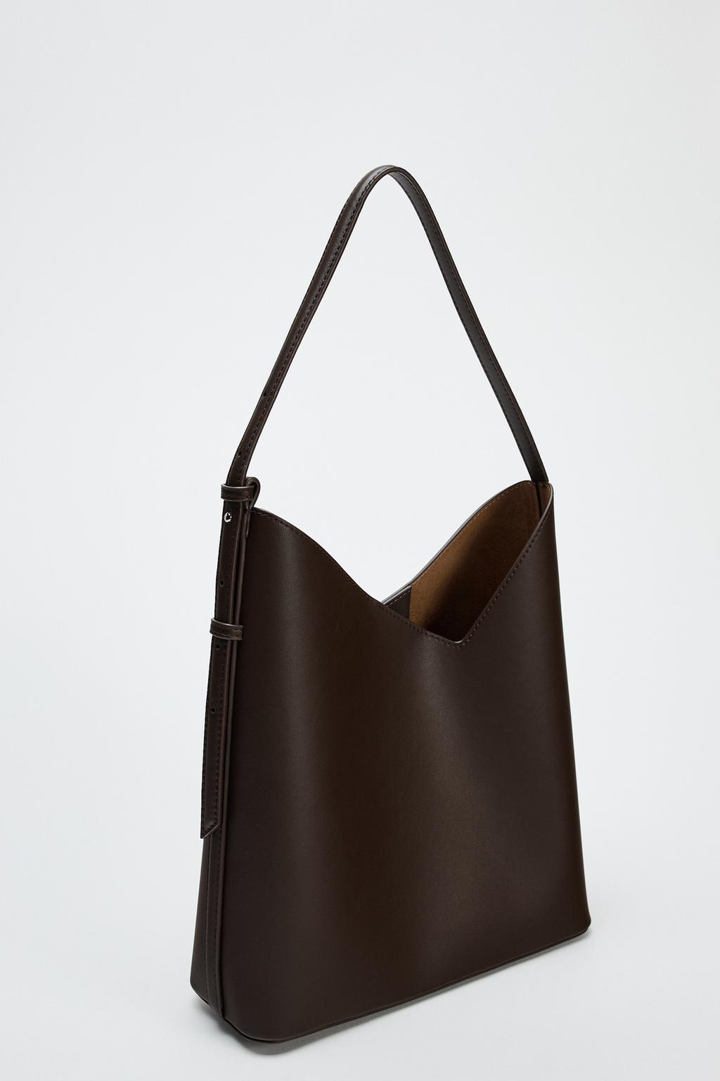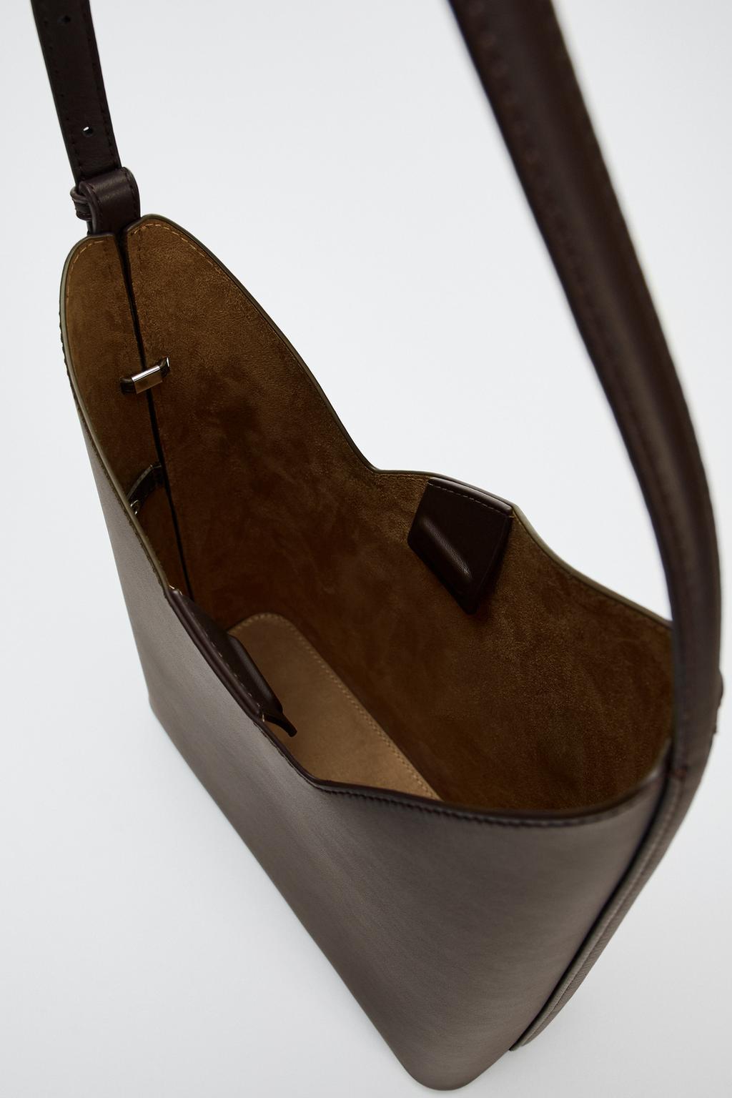 Bucket bag with adjustable shoulder strap. Removable zipped inner pocket. Magnetic clasp closure.