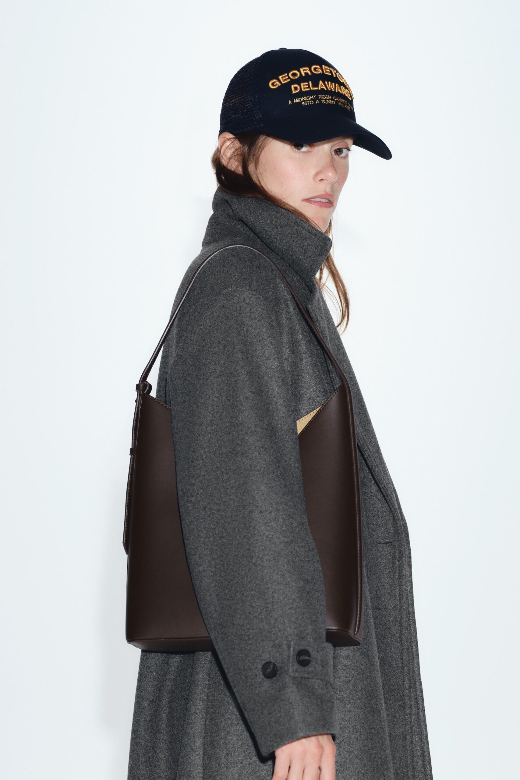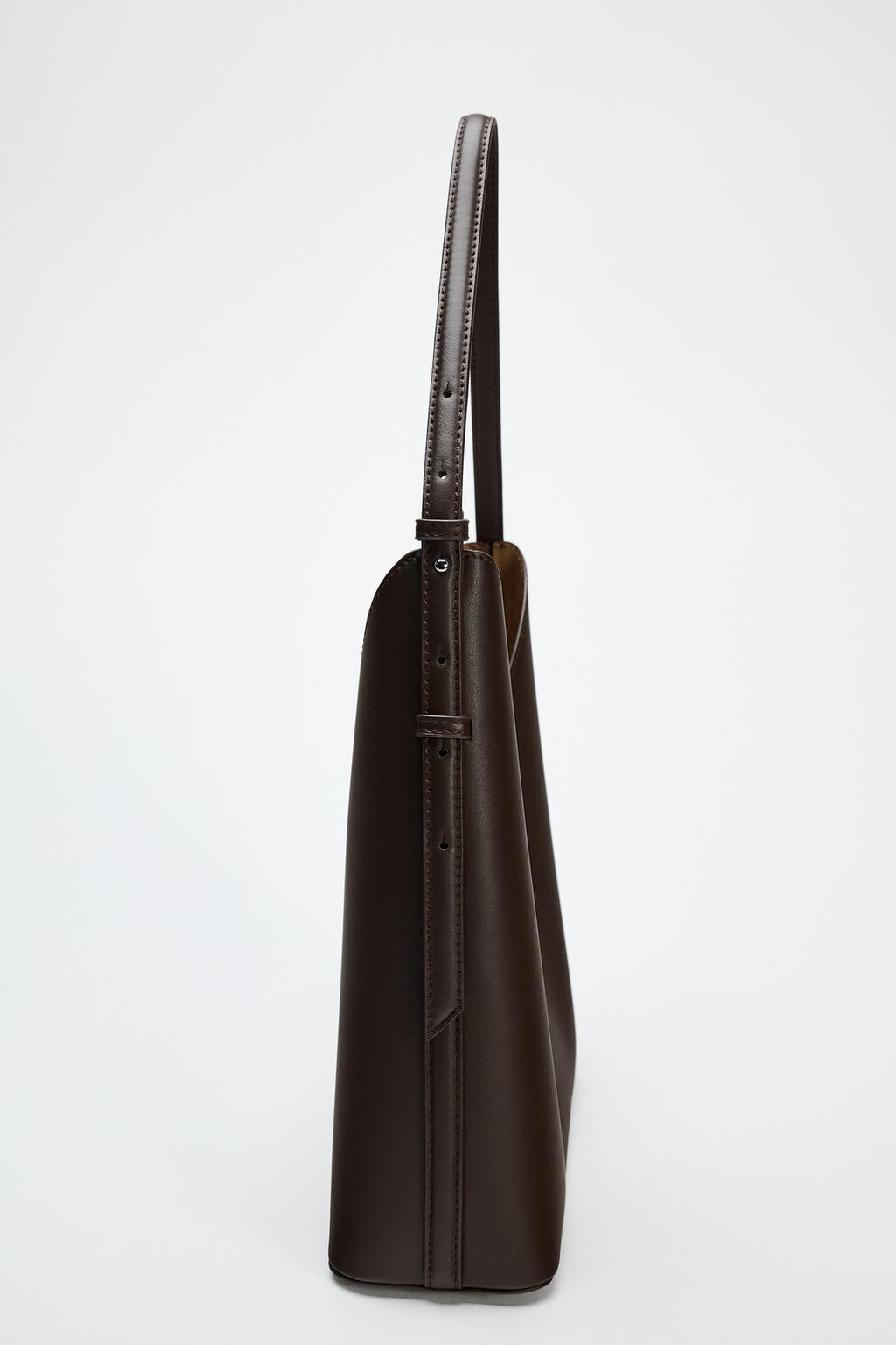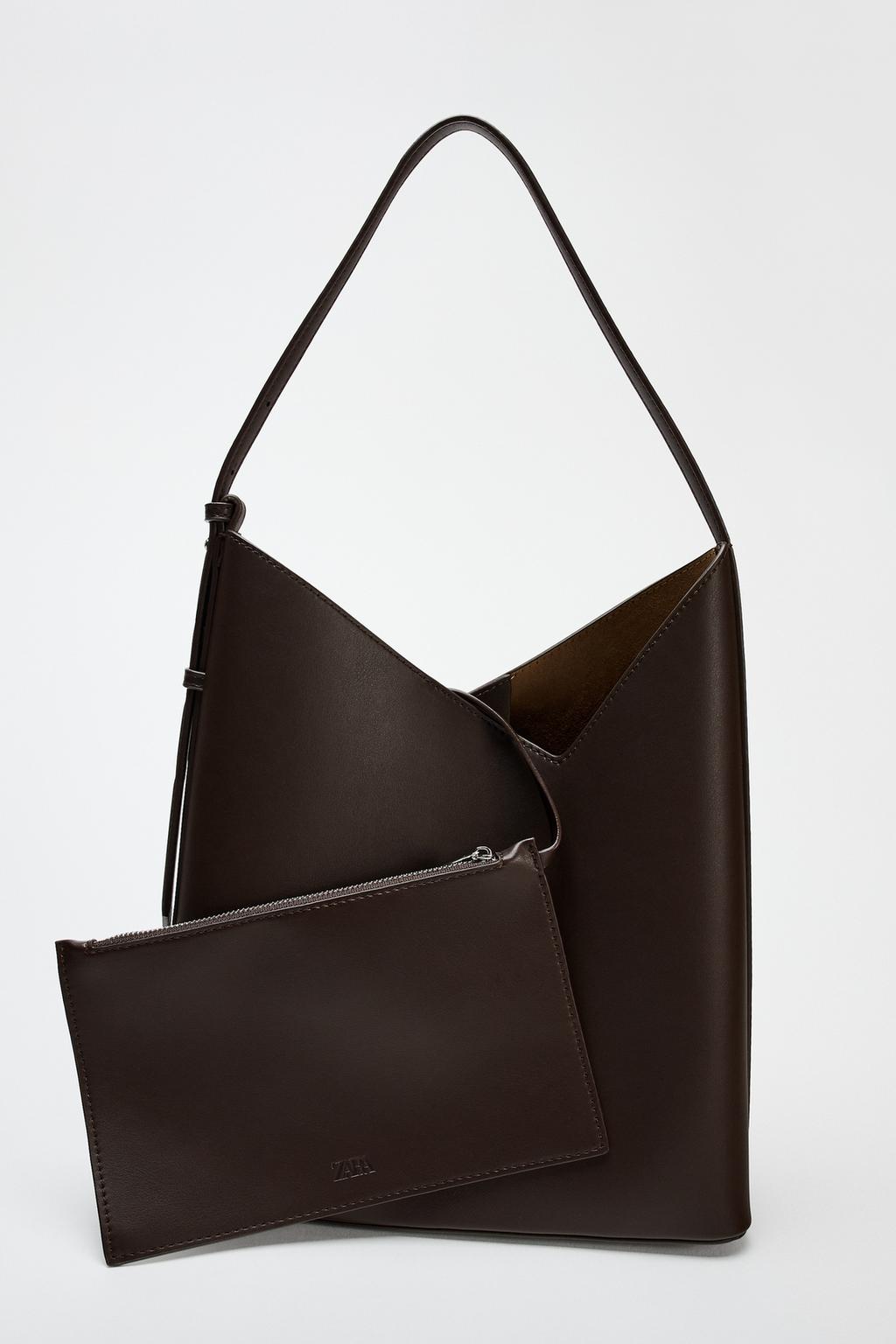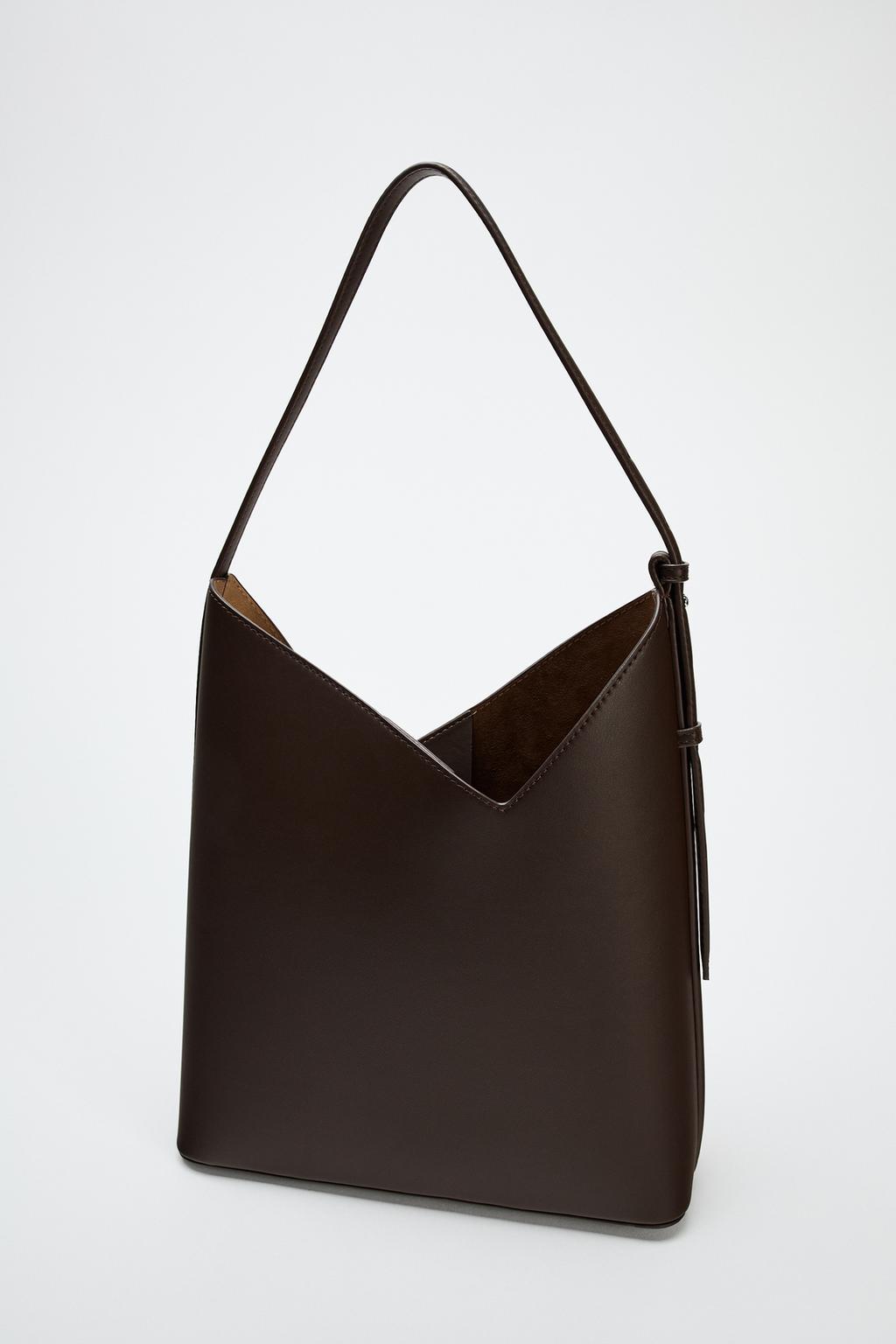 Bucket bag with adjustable shoulder strap. Removable zipped inner pocket. Magnetic clasp closure.